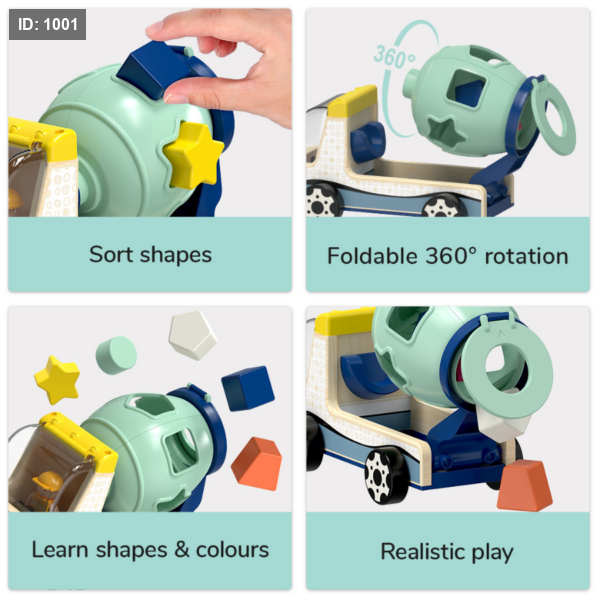 يمكن للأطفال إدخال 7 أشكال مختلفة داخل خزان الشاحنة الدوّار، مما يساعدهم على التعرف على الأشكال ومطابقتها. كما يمكنهم تدوير الخزان لخلط الأشكال وإخراجها مرة أخرى لمواصلة اللعب.