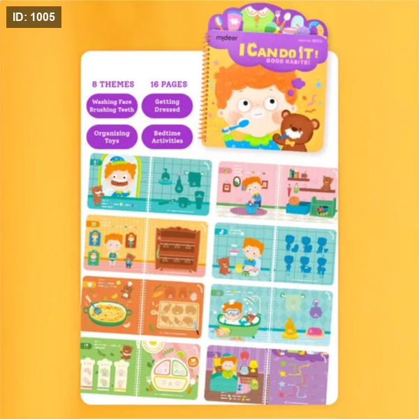 يتكون الكتاب من 16 صفحة تعليمية موزعة على 8 مواضيع مختلفة تغطي مواقف الحياة اليومية مثل تنظيف الأسنان، ارتداء الملابس، ترتيب الألعاب، وأنشطة وقت النوم. ويتميز بتقسيم كل نشاط إلى ثلاث مراحل: منطقة التفاعل، منطقة التمرين، ومنطقة المكافآت، مما يساعد الأطفال على التعلم خطوة بخطوة بطريقة واضحة وممتعة.