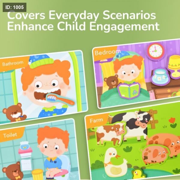 يغطي الكتاب 8 مواضيع من الحياة اليومية تساعد الطفل على فهم الروتين اليومي، مثل: