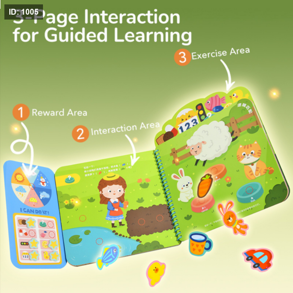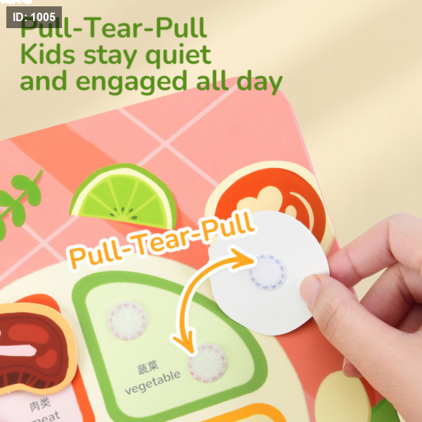 تحتوي الصفحات على ملصقات فيلكرو قابلة للإزالة وإعادة الاستخدام، مما يسمح للأطفال بالتجربة عدة مرات ويعزز عملية التعلم بالممارسة. كما أن الصفحات مصنوعة من كرتون سميك ومتين مع زوايا مستديرة لسلامة الأطفال، وتصميم حلقي يسمح بفتح الكتاب بسهولة واستخدامه من أي زاوية.