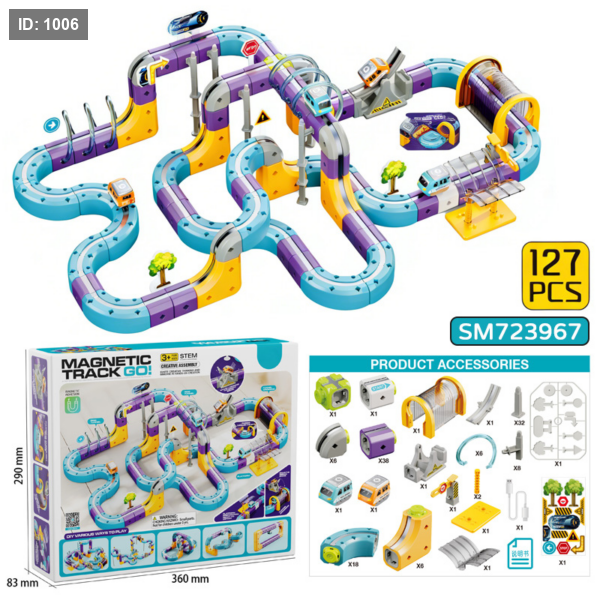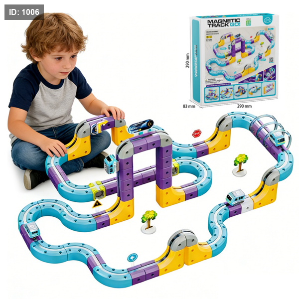 مجموعة مسار قطار مغناطيسي متطورة تتيح للأطفال تصميم مسارات ثلاثية الأبعاد مذهلة تشمل: