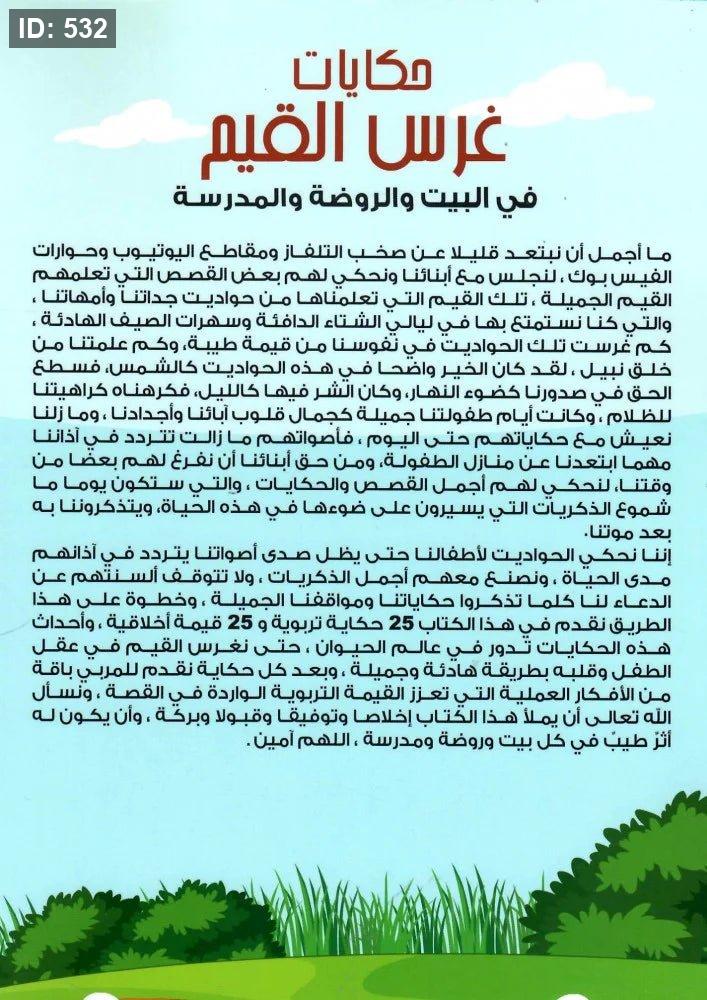 ما أجمل أن نبتعد قليلا عن صخب التلفاز ومقاطع اليوتيوب وحوارات الفيس بوك لنجلس مع أبنائنا ونحكي لهم بعض القصص التي تعلمهم القيم الجميلة، تلك القيم التي تعلمناها من حواديت جداتنا وأمهاتنا والتي كنا نستمتع بها في ليالي الشتاء الدافئة وسهرات الصيف الهادئة كم غرست تلك الحواديت في نفوسنا من قيمة طيبة، وكم علمتنا من خلق نبيل، لقد كان الخير واضحا في هذه الحواديت كالشمس، فسطع الحق في صدورنا كضوء النهار ، وكان الشر فيها كالليل، فكرهناه كراهيتنا للظلام، وكانت أيام طفولتنا جميلة كجمال قلوب آبائنا وأجدادنا، وما زلنا تعيش مع حكاياتهم حتى اليوم، فأصواتهم ما زالت تتردد في آذاننا مهما ابتعدنا عن منازل الطفولة، ومن حق أبنائنا أن نفرغ لهم بعضا من وقتنا، لنحكي لهم أجمل القصص والحكايات، والتي ستكون يوما ما شموع الذكريات التي يسيرون على ضوءها في هذه الحياة، ويتذكروننا به بعد موتنا إننا نحكي الحواديت لأطفالنا حتى يظل صدى أصواتنا يتردد في آذانهم مدى الحياة، ونصنع معهم أجمل الذكريات، ولا تتوقف ألسنتهم عن الدعاء لنا كلما تذكروا حكاياتنا ومواقفنا الجميلة، وخطوة على هذا الطريق نقدم في هذا الكتاب 25 حكاية تربوية و 25 قيمة أخلاقية، وأحداث هذه الحكايات تدور في عالم الحيوان ، حتی نغرس القيم في عقل الطفل وقلبه بطريقة هادئة وجميلة ، وبعد كل حكاية نقدم للمربي باقة من الأفكار العملية التي تعزز القيمة التربوية الواردة في القصة ، ونسأل الله تعالى أن يملأ هذا الكتاب إخلاصا وتوفيقا وقبولا وبركة ، وأن يكون له أثر طيب في كل بيت وروضة ومدرسة، اللهم آمين .