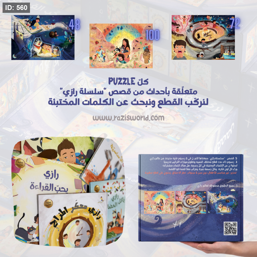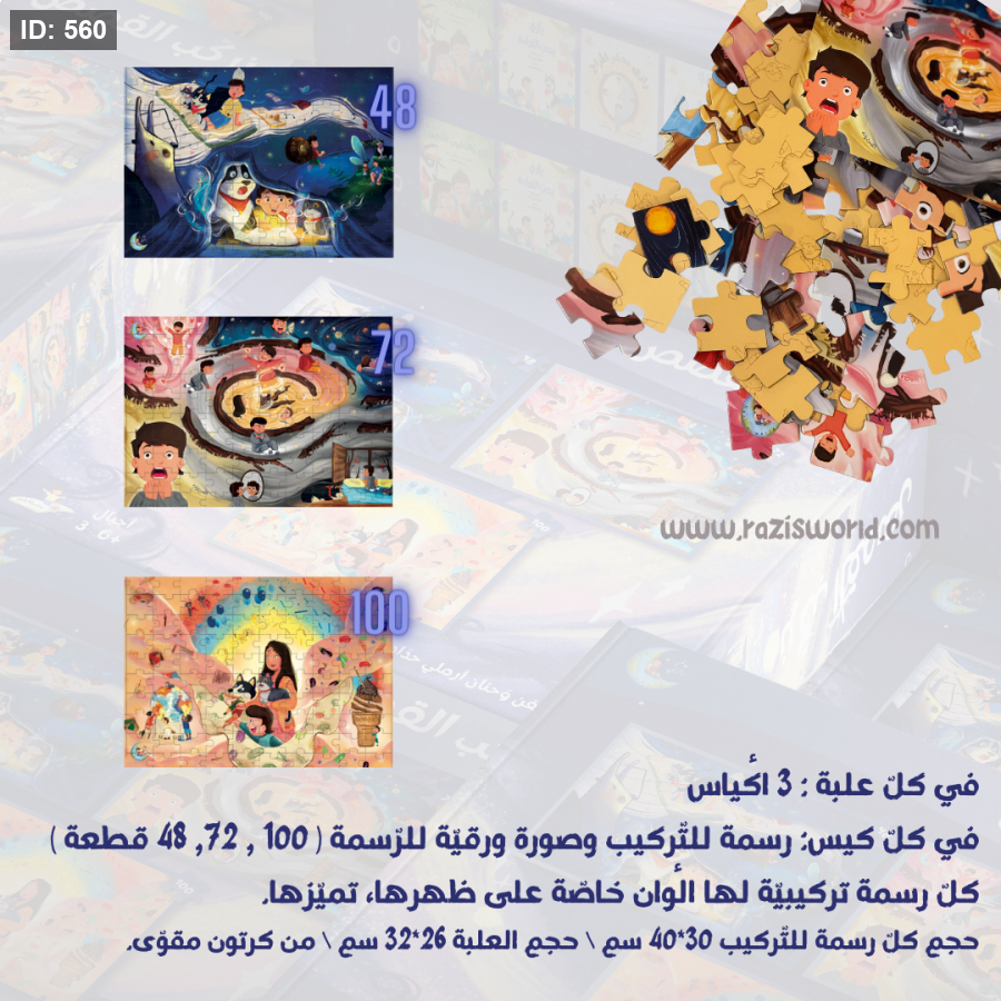 صندوق نركّب القصص: 3 puzzles مع رسوم جديدة من وحي قصص سلسلة رازي، فيها 3 أكياس مختلفة تتضمّن 48 قطعة، 72 قطعة، 100 قطعة.
